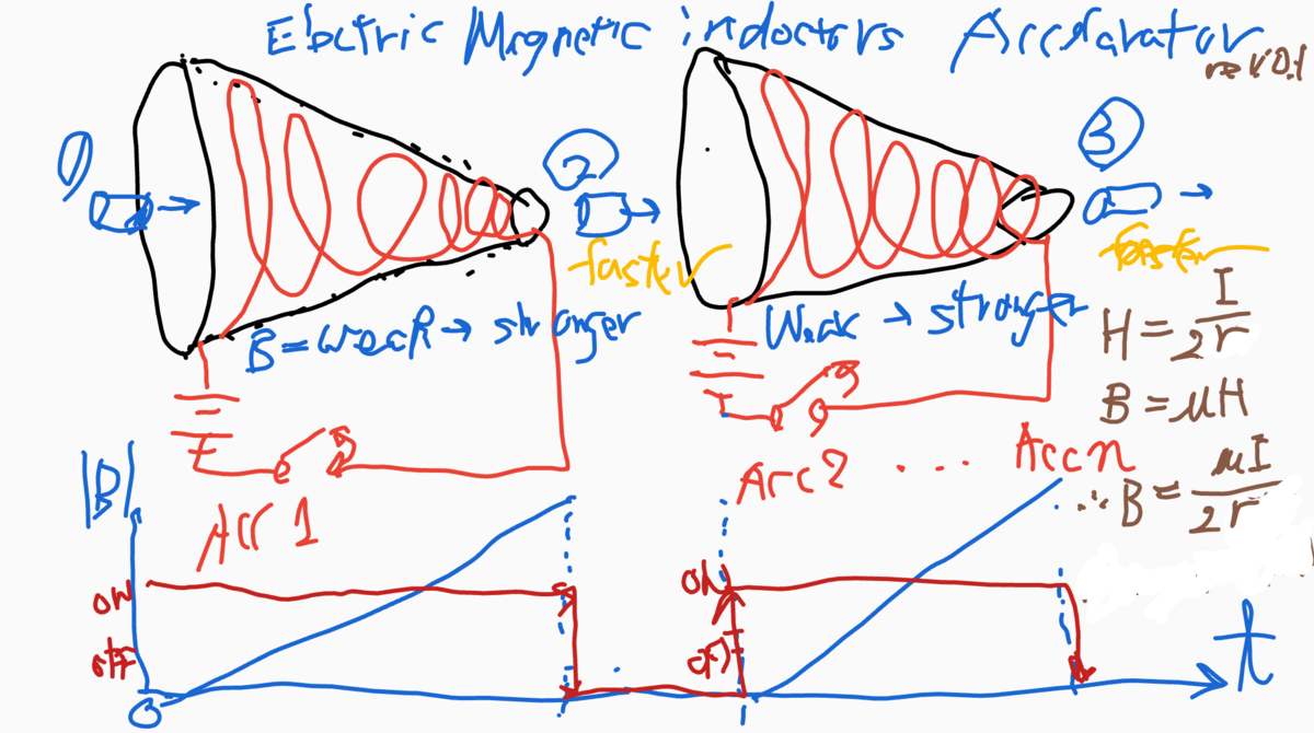 円形電流の磁場の式 H=I/(2r)に従って、コイルの半径r[m]に反比例して磁界Hが強くなる原理を応用し、磁性体を加速する加速装置のアイディアです。